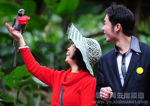2月2日,游客在西雙版納野象谷景區(qū)游覽,象征幸運(yùn)的小鳥(niǎo)銜著紅花飛到游客手中,送去一份祝福。