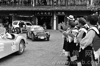 麗江市民夾道歡迎歐洲老爺車隊。本報駐麗江記者袁海毅攝 這對麗江來說本該是一個狂歡的下午,但在舉國哀悼玉樹遇難同胞的特別時刻,同樣受過地震災難的麗江人民以一種特別的方式來迎接歐洲老爺車隊的到來。