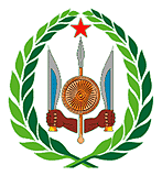 國徽:圓形。中心圖案由五角星、矛、刀、盾等構成。一雙黑人的巨手各握一把利刀,兩把刀之間是一個圓形的盾,盾后有一支長矛,矛上端是一顆象征獨立自由的紅色五角星。圖案以綠色橄欖枝環飾。整個圖案象征吉布提人民時刻準備著捍衛祖國的獨立和自由,也表達了該國人民熱愛和平的美好愿望。
