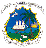 國徽:盾形。盾面上的白色帆船象征當年美國黑奴獲得自由后,乘坐這樣的帆船回到了他們祖先的居住地——非洲。棕櫚樹及綠地象征這個新獨立國家的肥沃土地。農具圖案象征當年自由黑奴使用的生產工具。上端的綬帶上用英文寫著“熱愛自由使我們來到這里”。下端的綬帶上寫著“利比里亞共和國”。