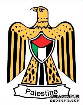 國徽:為一只雄鷹,胸前的盾面為國旗圖案。底部用英文寫著“巴勒斯坦”。