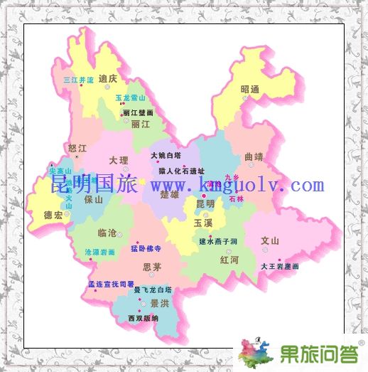 下圖黑色小字為云南省內最有名的旅游景點,也是云南每個城市的代表景點,必去景點哦,大家看看有哪些吧!