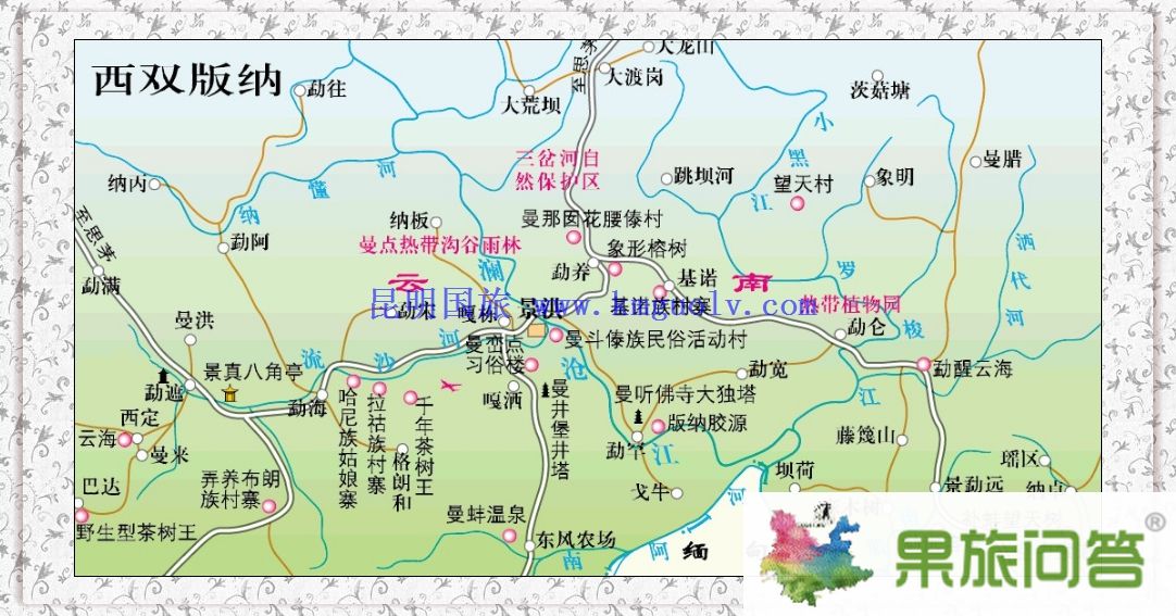 下圖是西雙版納的旅游景點,云南省內景點最集中的我看也是非版納莫屬了,而且景點較多。特別是景洪市區同邊,加上版納很多獨特的民族節日和風俗習慣,慢慢成為了國內旅游的焦點。