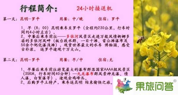 感謝您來到昆明國際旅行社網站,文章有用可以收藏或分享這個網頁,可直接復制: 原標題:云南旅游租車純玩線路_羅平2日游/油菜花/博覽園/九龍瀑布 http://www.ei57.com/zixun/yunnanluoping/21707.html 然后轉發好友,讓大家知道這個羅平旅游資訊吧!如有發現侵權可以直接聯系站長為您刪除。